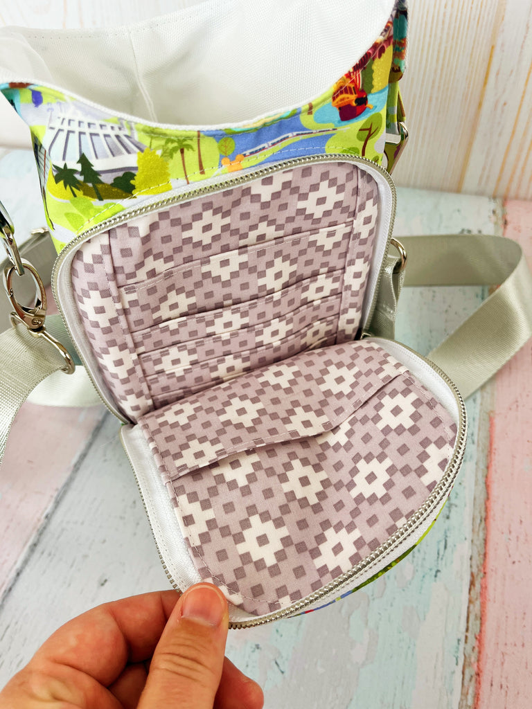 Exterior zipper pocket opens to two slip pockets and 4 card slots.