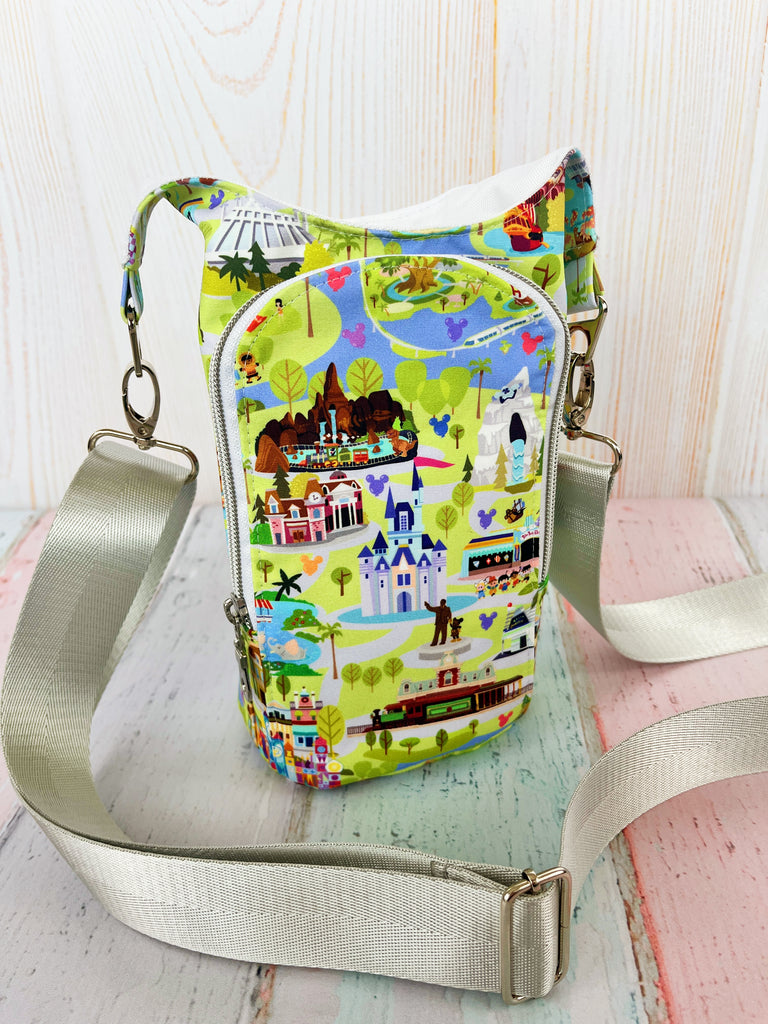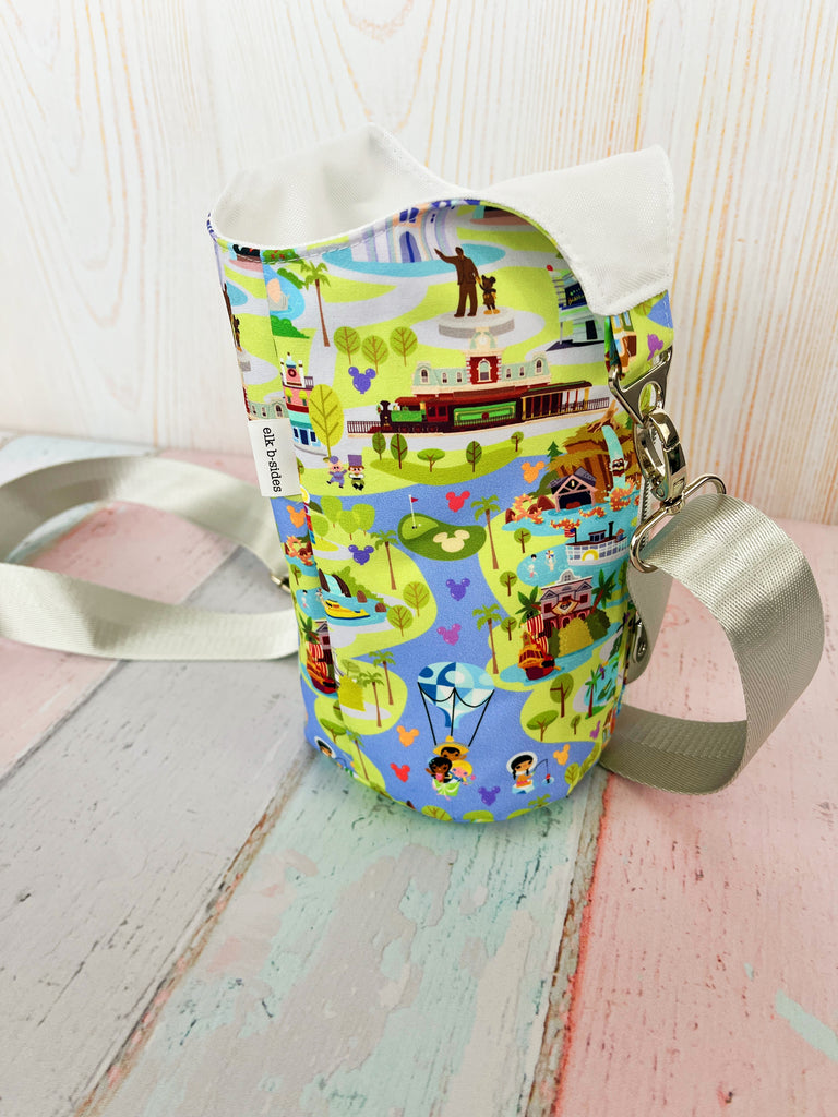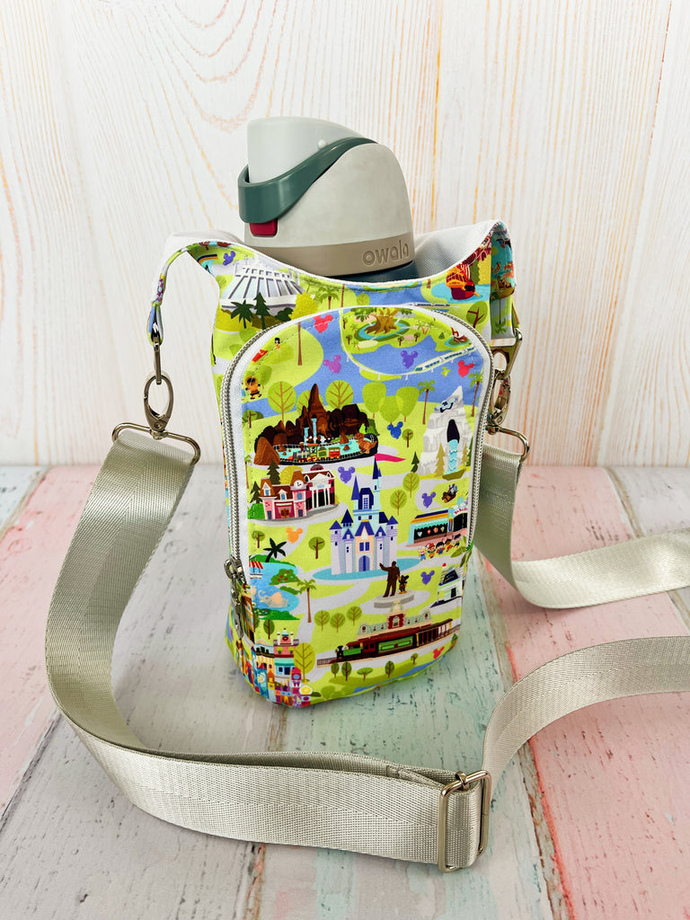 Waterproof canvas lined bag designed for holding a variety of water bottles. Measures about 11" at tallest point with an oval shaped base about 6" x 4". Shown with a 24 ounce Owala water bottle.