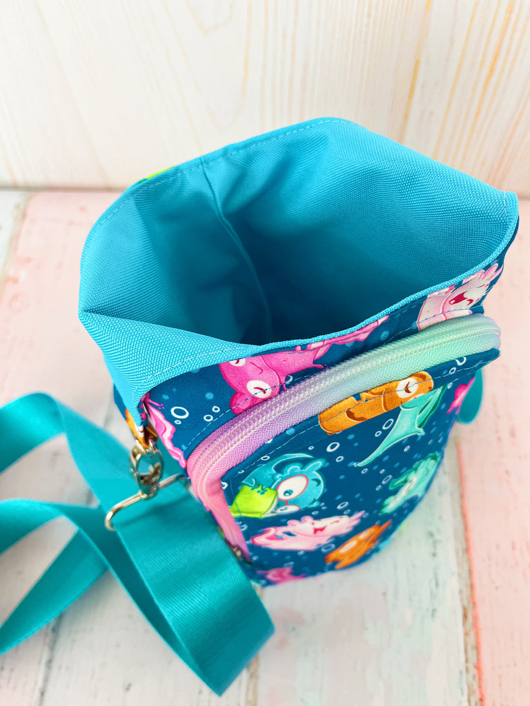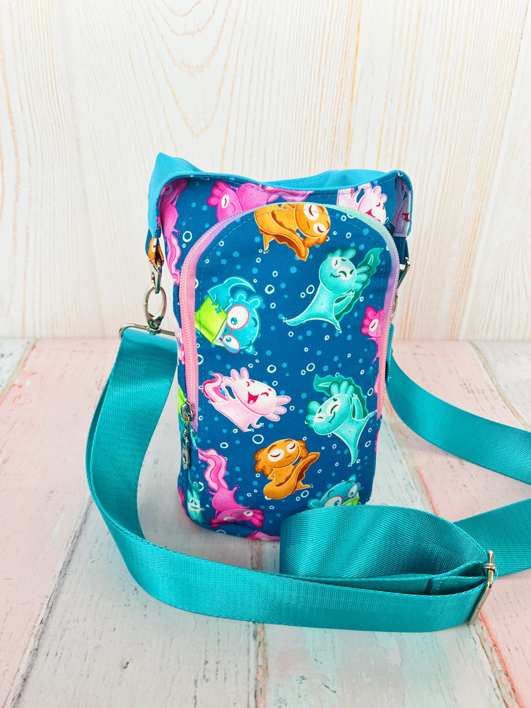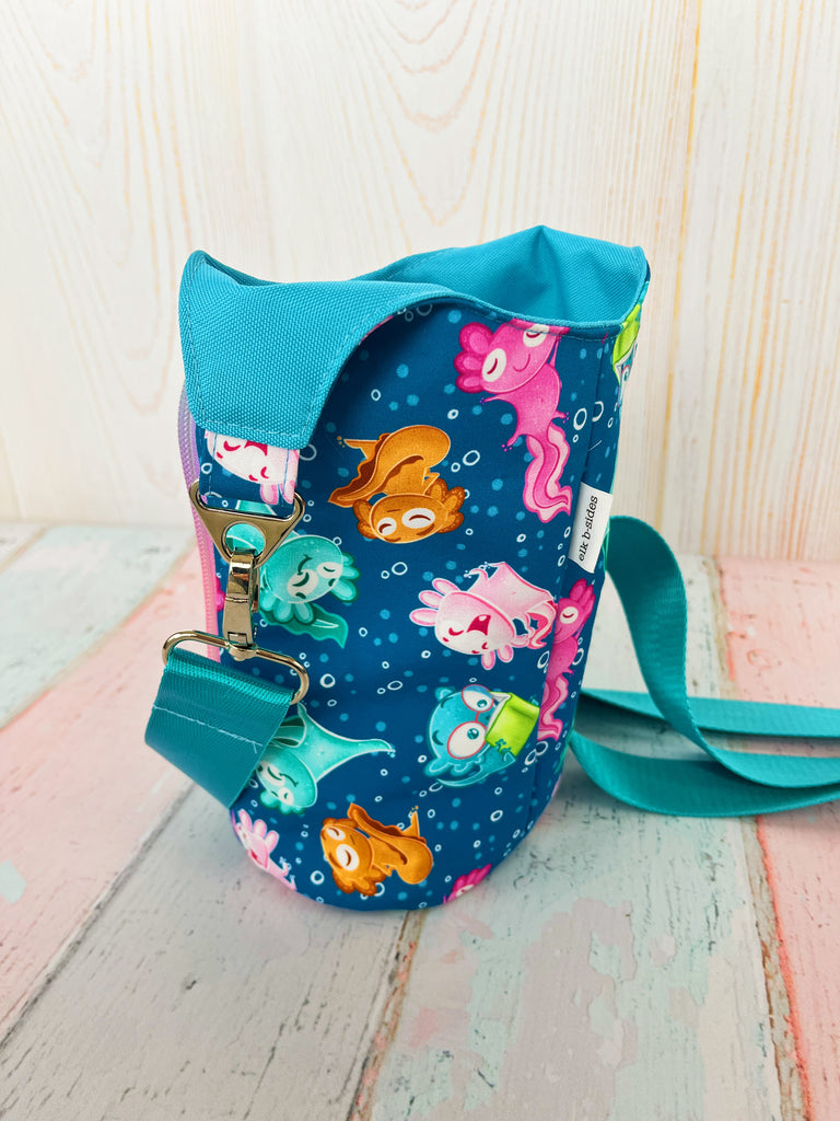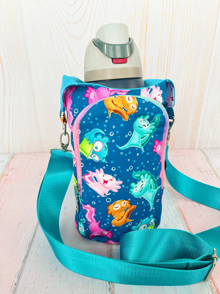 Waterproof canvas lined bag designed for holding a variety of water bottles. Measures about 11" at tallest point with an oval shaped base about 6" x 4". Shown with a 32 ounce Owala water bottle.